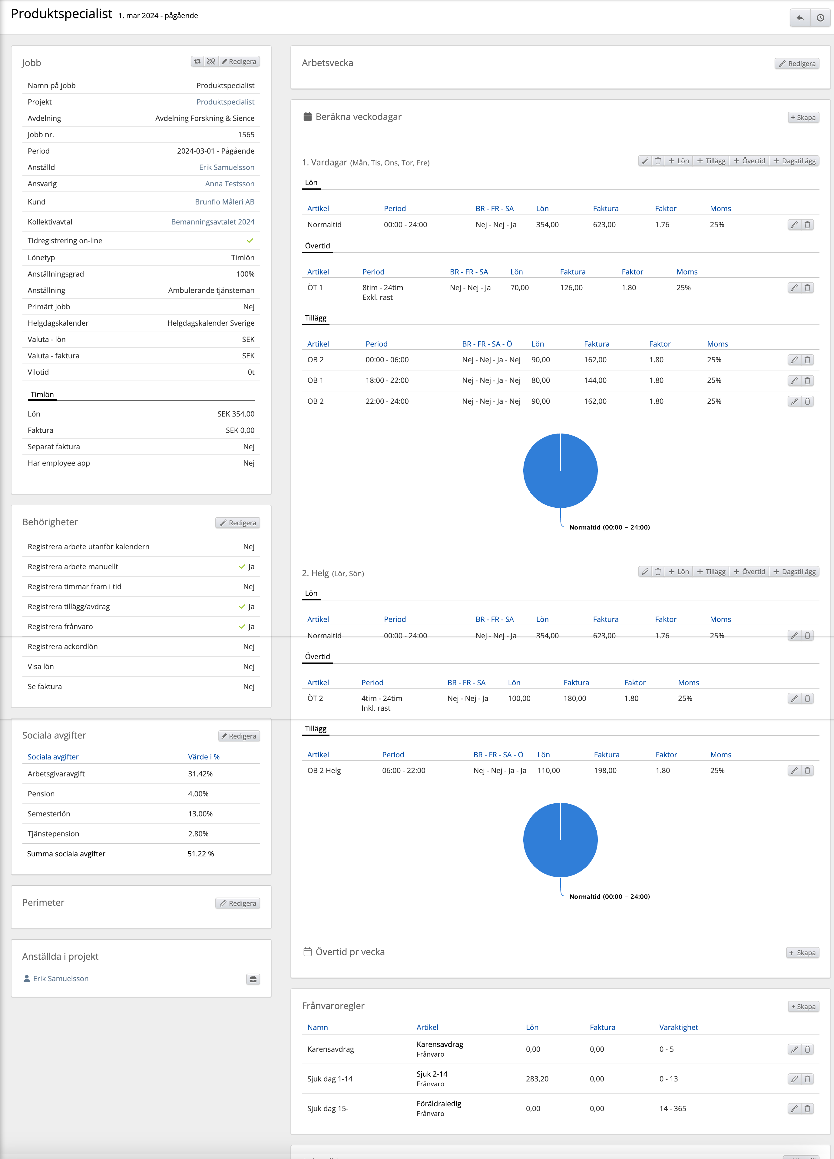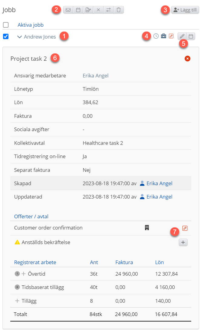 - Anställda: Här kan du se en lista över alla anställda med jobb i projektet. Varje jobb visas separat.