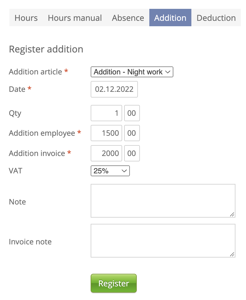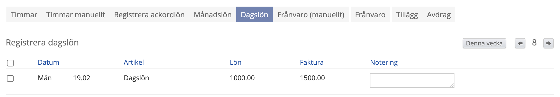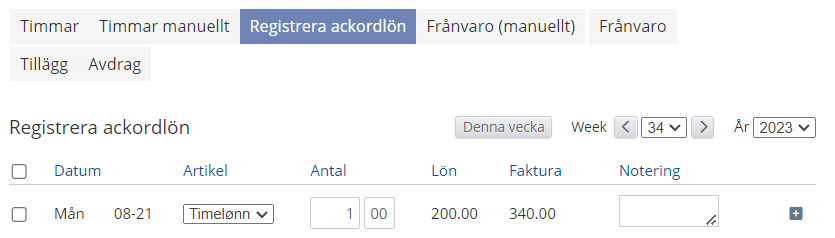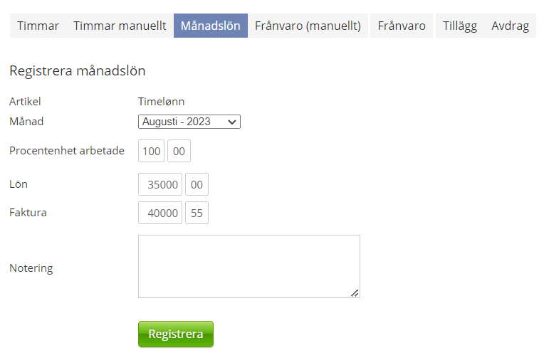 Med relevanta fält ifyllda kan jobbet skapas och den anställda kan börja tidrapportera. Vid tidrapportering/registrering av arbete faller artiklar ut utifrån de regler som finns uppsatta i kollektivavtalet.
