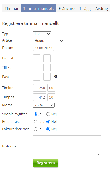 - Registreringsfönster: Här kan du registrera timmar. I allmänhet måste du ange starttid, sluttid och välja vilka dagar innan du trycker på knappen Registrera för att spara registreringen. Observera att vissa artikeltyper registreras på olika sätt, och exempel ges nedan.