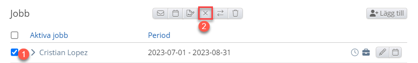 - Namn på den anställda, samt möjligheten att bocka i ett eller flera jobb. Om du bockar i kommer knapparna på nummer 2 att visas.