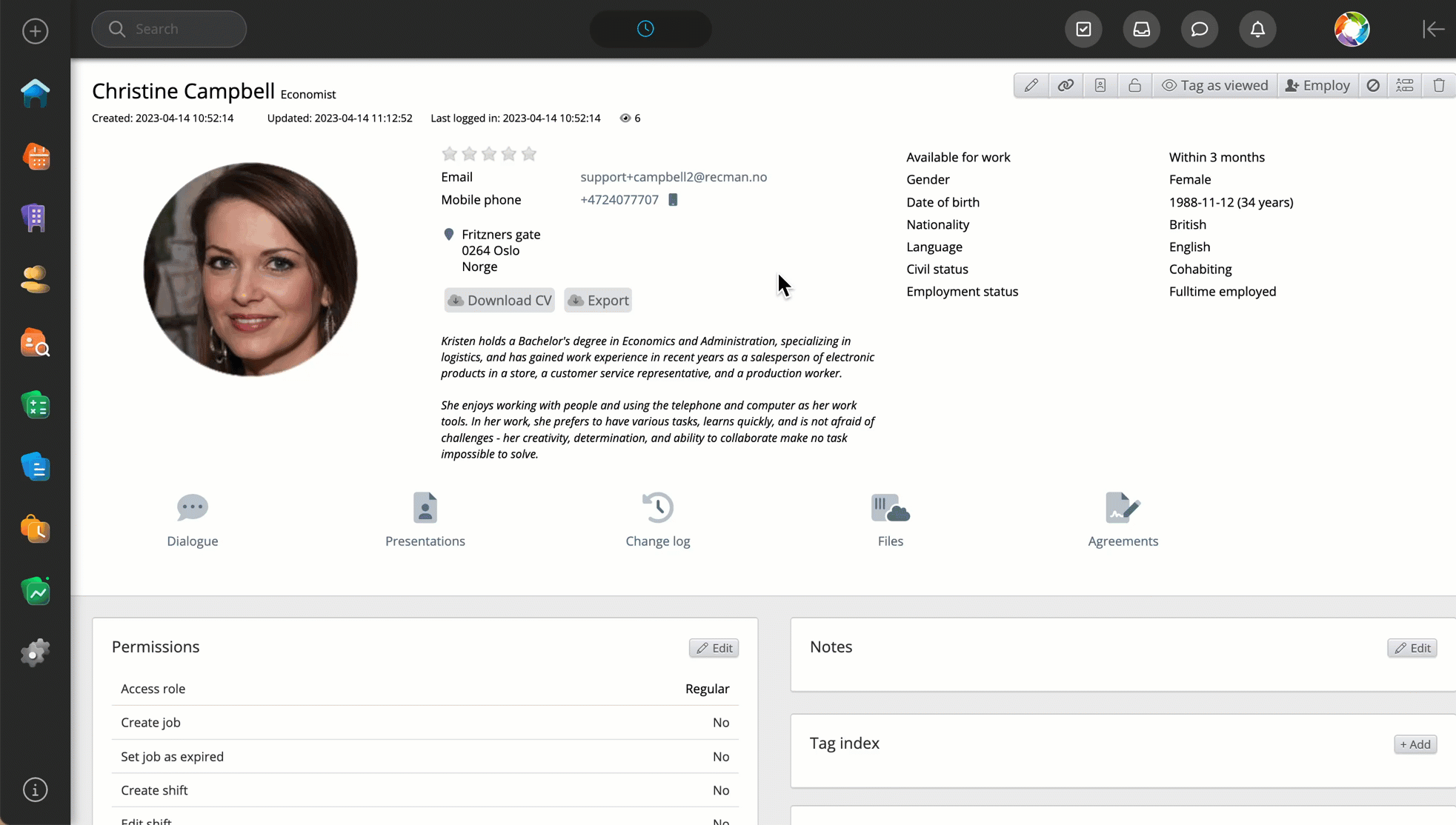 För att skapa ett jobb i RecMan behöver kandidaten först vara anställd. Du anställer en kandidat genom att till höger på kandidatkortet klicka på Anställ. När kandidat är anställd tillkommer ytterligare ikoner på kandidatkortet; Jobb, Anställning, Registrerat arbete och Arbetskalender. Genom att klicka på Anställning kan ytterligare information för anställningen fyllas i. Ligger till exempel timlön eller månadslön angiven i anställningen kommer det automatiskt att fyllas i när du skapar ett jobb.