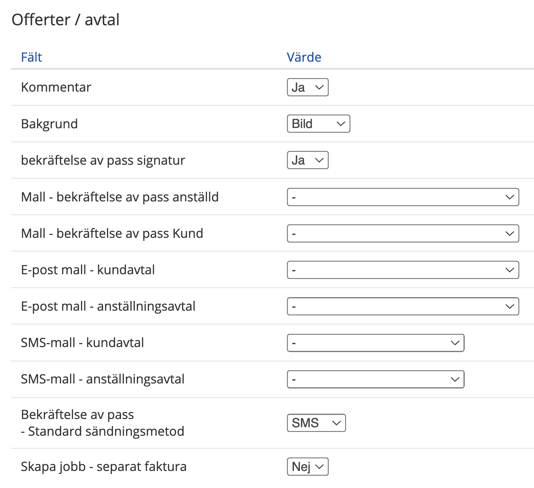Som du kan se har du möjlighet att välja mellan två olika mallar, både när det gäller avtalet medarbetaren och mot det mot kunden. Mallarna som definieras här blir valda automatiskt när du använder översiktsvyn för arbetspassavtal, om du inte definierar dem på projektnivå. Mallarna hämtas från Mallar i systeminställningarna, som du kan läsa om mer här.