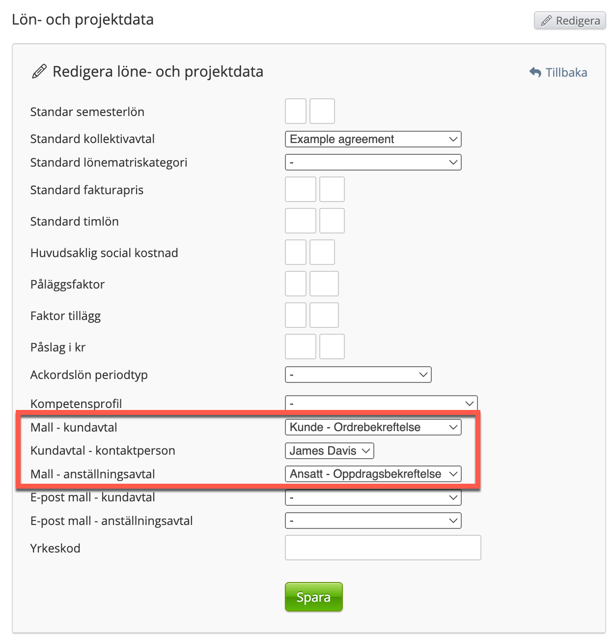 Även från projektet kan vi ange vilken mall som ska användas, men utöver det kan vi där också ange vilken kontakt som ska användas som standard. Den här kontakten kommer väljas per automatik när du skapar ett arbetspassavtal från översiktsvyn för arbetspassavtal. Du hittar de här inställningarna under Löne- och projektdata på projektkortet.