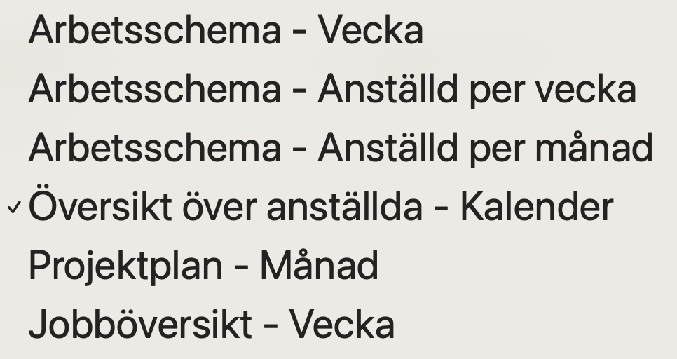 | Arbetsschema – vecka | Visar vilka medarbetare som finns ute på uppdrag en specifik vecka, sorterat på veckodag. | Arbetsschema |