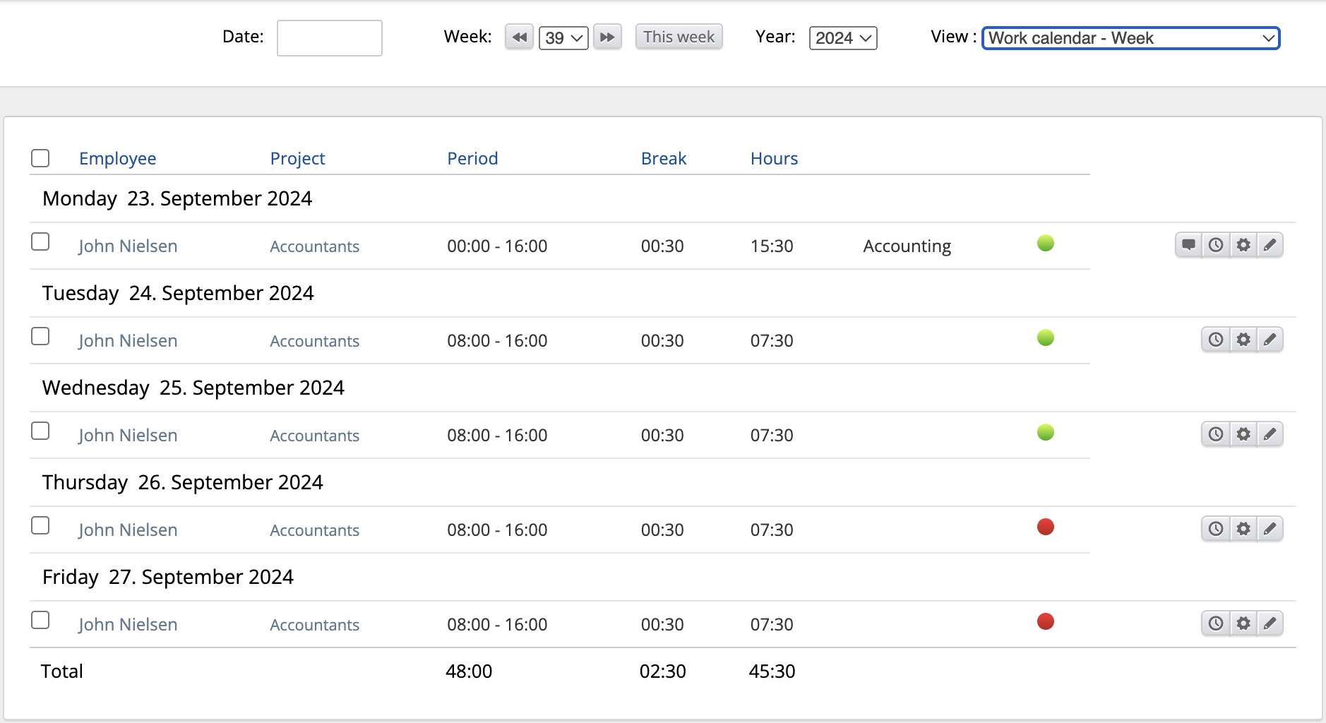 Till vänster har du en lista över alla anställda som har pass under den valda perioden (vecka). I veckans översikt kan du se om de anställda har ett pass den dagen och tidpunkten för passet. Som i de andra två översikterna visar färgerna här om det finns registrerat arbete på passet eller inte. Längst till höger kan du se det totala antalet timmar för pass för en anställd under en given period. Summan på nedersta raden är det totala antalet timmar per dag för alla anställda.