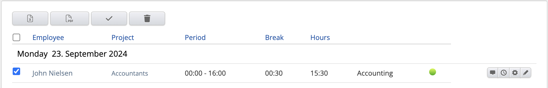 Dessutom visas vilket projekt passet är kopplat till, tidsperioden, rast, antal timmar, pricken som visar status för timmarna samt knappar med ytterligare funktioner.