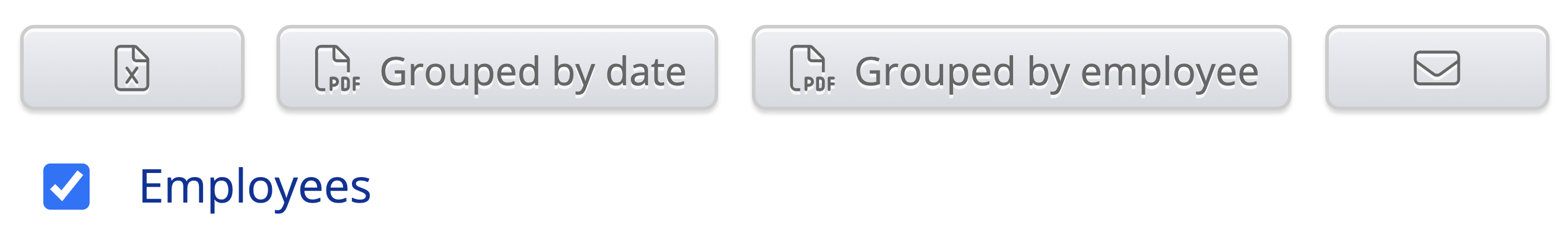Om du markerar en eller flera anställda får du ytterligare alternativ. Här får du möjlighet att ladda ner passen i Excel- eller PDF-format med olika översikter och att skicka e-post till de anställda.