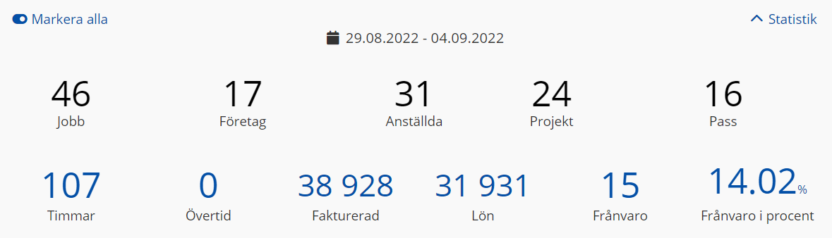Fälten längst upp (som syns i bilden nedan) ger dig en enkel översiktsbild av antalet jobb, företag, anställda, projekt och arbetspass som relaterar till den valda perioden.