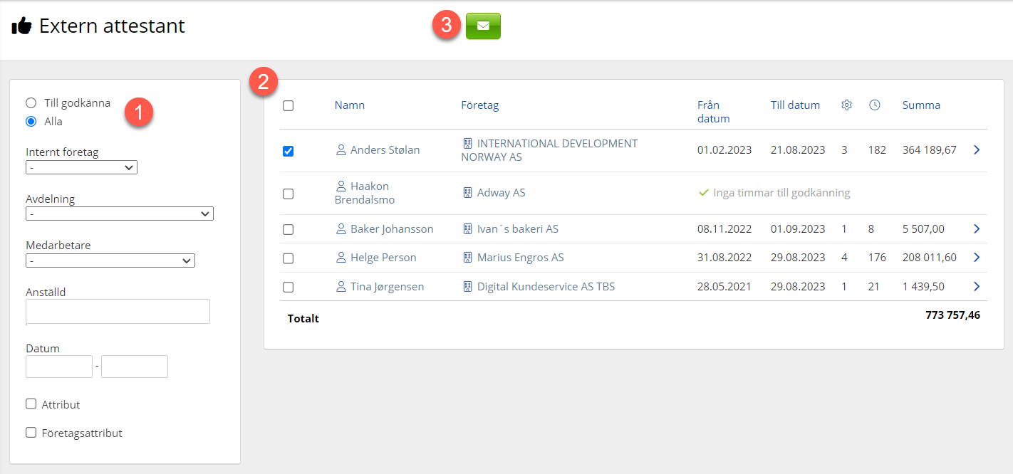 - I det här fältet ser du resultatet av din sökning och dina filter. Du får en snabb överblick över attestanterna med information som namn, företag, från/till datum, antal projekt de är kopplade till, antal registrerade timmar, samt summan de har för godkännande.