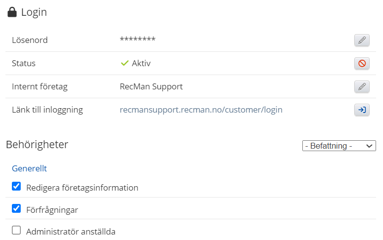 - Förfrågningar – Ger behörighet att skapa förfrågningar direkt i RecMan och hålla koll på de som lagts till tidigare.