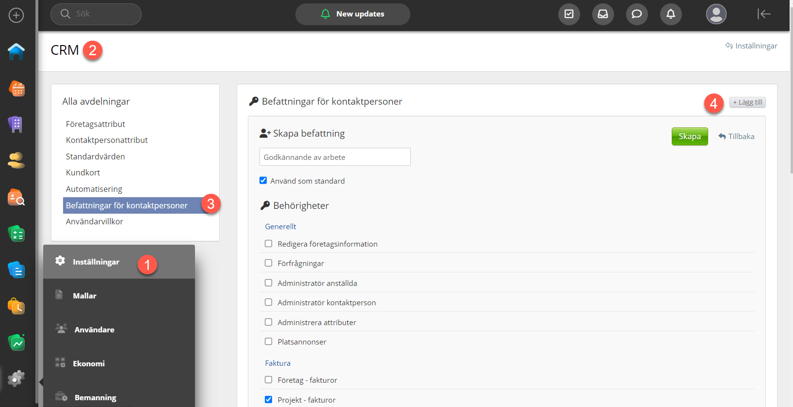 För att skapa en ny befattning går du till Systeminställningar → CRM → Befattningar för kontaktpersoner → +Lägg till: