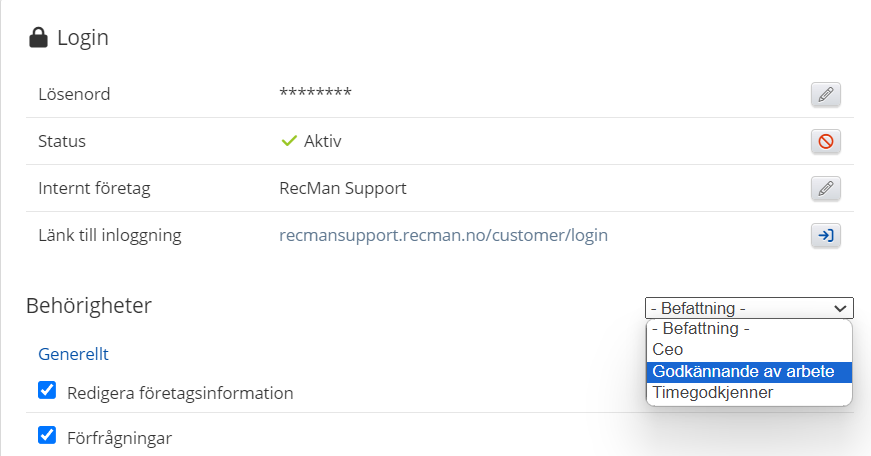 - Företag - Godkänn timmar – Ger åtkomst att godkänna registrerat arbete oavsett projekt, så länge arbetet är kopplat till egna företaget.