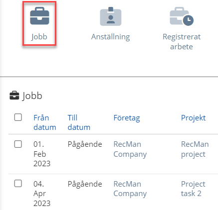 Varje enskilt jobb den anställde har, så länge elektronisk registrering är påslagen, kommer att synas i deras profil. I exemplet nedan arbetar medarbetaren med två separata projekt där han kan logga arbete.
