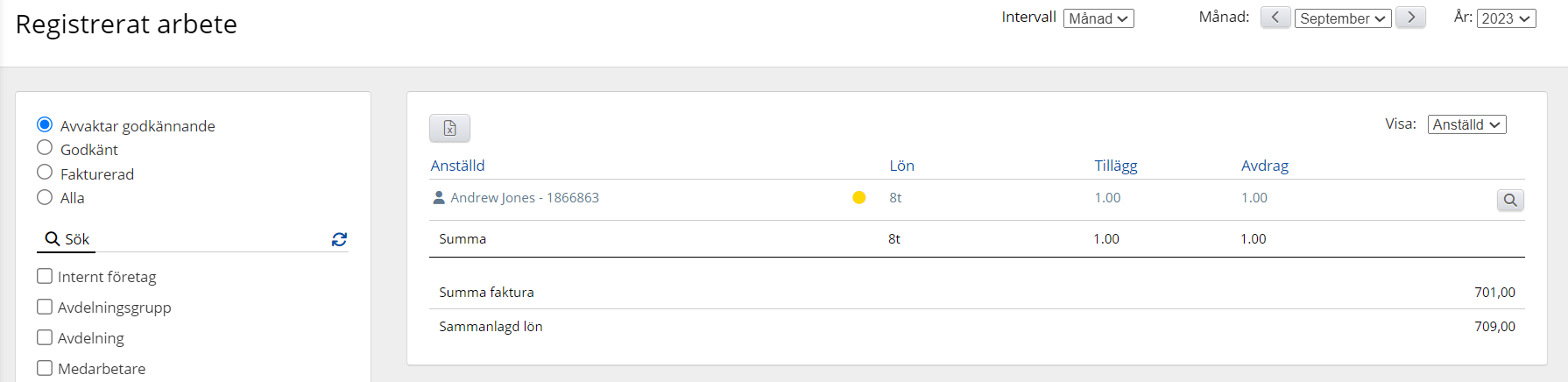 Som tidigare nämnts har du i modulen Loggat arbete möjlighet att se timmar/dagar/tillägg etc. i systemet på många olika sätt. Nedan ser du ett exempel där vi använder följande filter:
