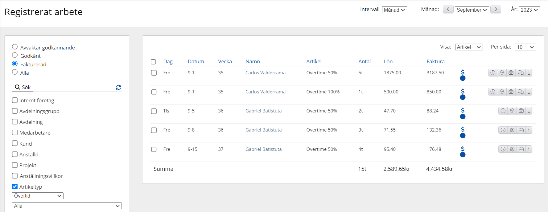 Se all övertid (artikeltyp övertid ) som har loggats i mars månad. Här vill vi se alla i urvalet som har fakturerats. Sorterat efter artikel.