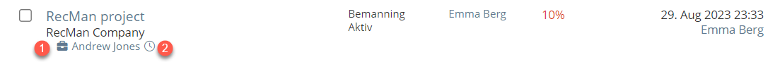 Som nämnts i början av artikeln kan medarbetare även logga arbete för medarbetaren. Detta kan göras genom att gå till projektöversikten där du får en överblick över alla projekt som är kopplade till företaget. Under de olika projekten i översikten kommer de anställda som är kopplade till den att listas. Bredvid namnet på den anställde finns två symboler: