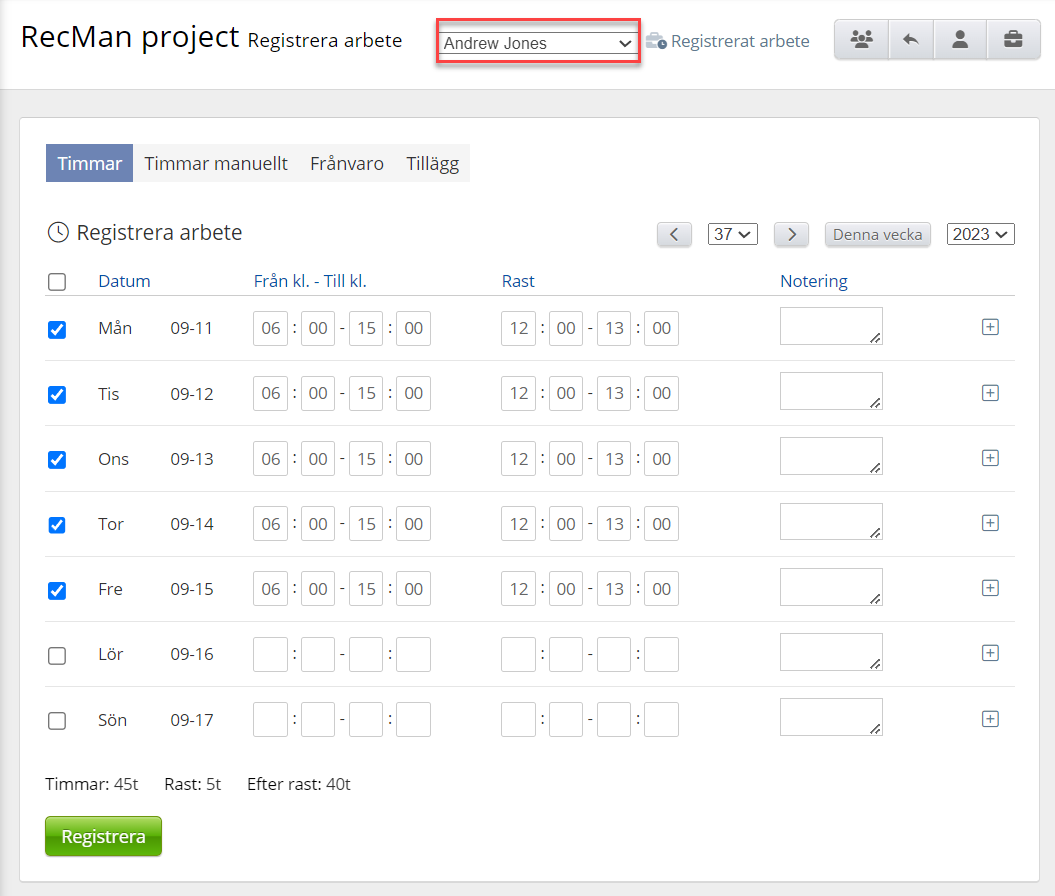 Systemet tillåter inte att du eller en anställd loggar arbete samtidigt, dvs loggar in samma period. Du kan dock logga flera bulks på samma dag. Till exempel 8.00 - 16.00 och sedan en ny från 17.00 till 20.00 osv.