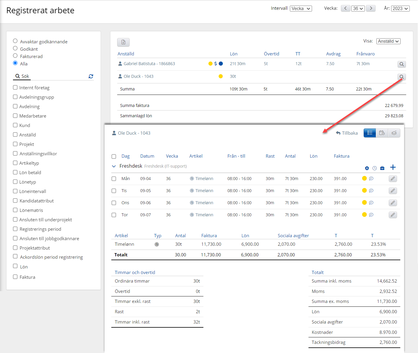 Medarbetaröversikten blir bra om ditt mål är att få en överblick över allt arbete som loggats på en anställd (se bild nedan).