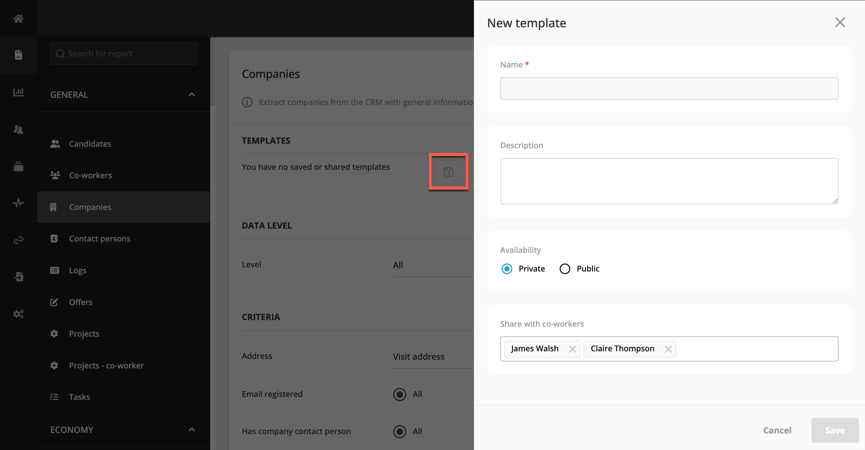 Du kan skapa och använda rapportmallar. De kan ha privat eller offentlig åtkomst. Mallar kan delas via ett autokompletteringsfält. Delade mallar är begränsade till endast visningsåtkomst, vilket förhindrar mottagare från att redigera, ta bort eller dela vidare.