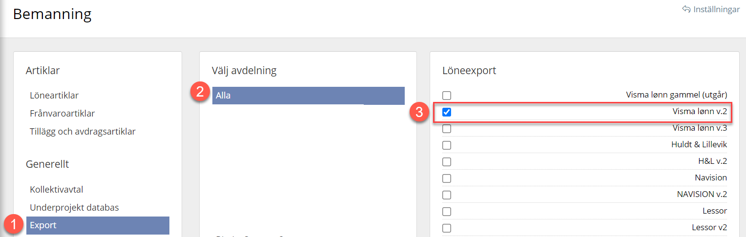 Gå till Systeminställningar → Bemanning → Exportera → Välj avdelning = Alla → kryssa i Visma Lønn v.2. Då kommer Visma lön att dyka upp som ett alternativ vid export av löneunderlag i RecMan.