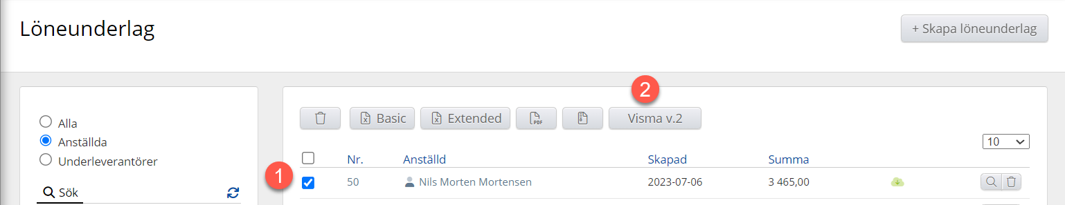 Gå sedan till Löneunderlag. När du nu kryssar för en eller flera lönebaser ser du att Visma Lønn v.2 dyker upp som ett val för export.