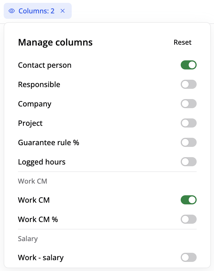 Gruppera efter: Kategorisera jobb i olika grupper baserat på kopplingar som anställd, avdelning, ansvarig medarbetare, projekt eller företag.