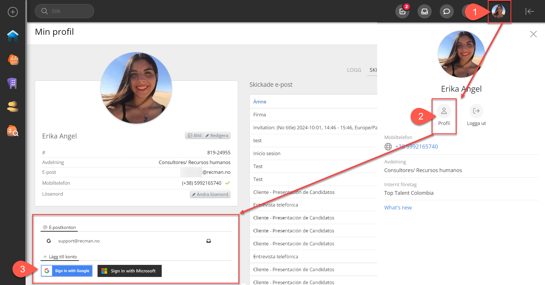 Genom att lägga till ett e-postkonto till din RecMan-användare i Min profil kan du skicka e-postmeddelanden från systemet med Google eller Microsoft. När det är konfigurerat kommer detta att visas i Skickade e-postmeddelanden, där de utgående e-postmeddelandena kommer att visa Gmail API eller Microsoft API.