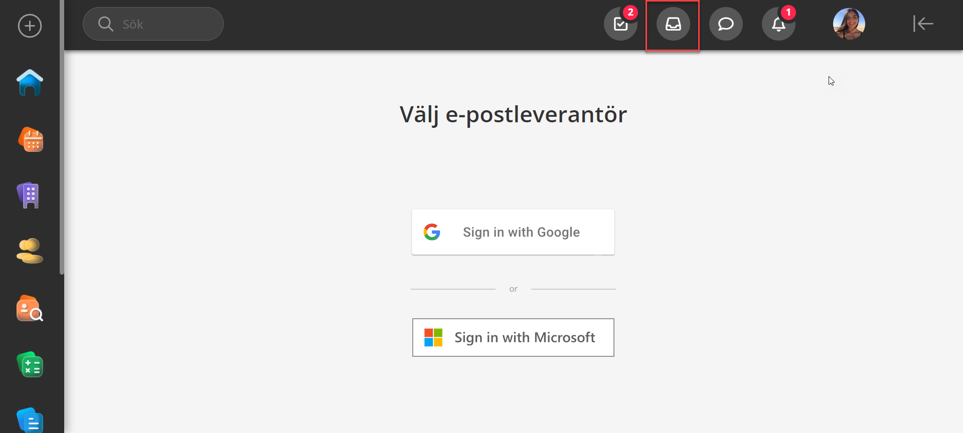 För att ställa in e-postintegreringen klickar du först på "E-post" och sedan under "Välj e-postleverantör" klickar du på Google eller Microsoft baserat på vilken leverantör du använder för e-posttjänster.