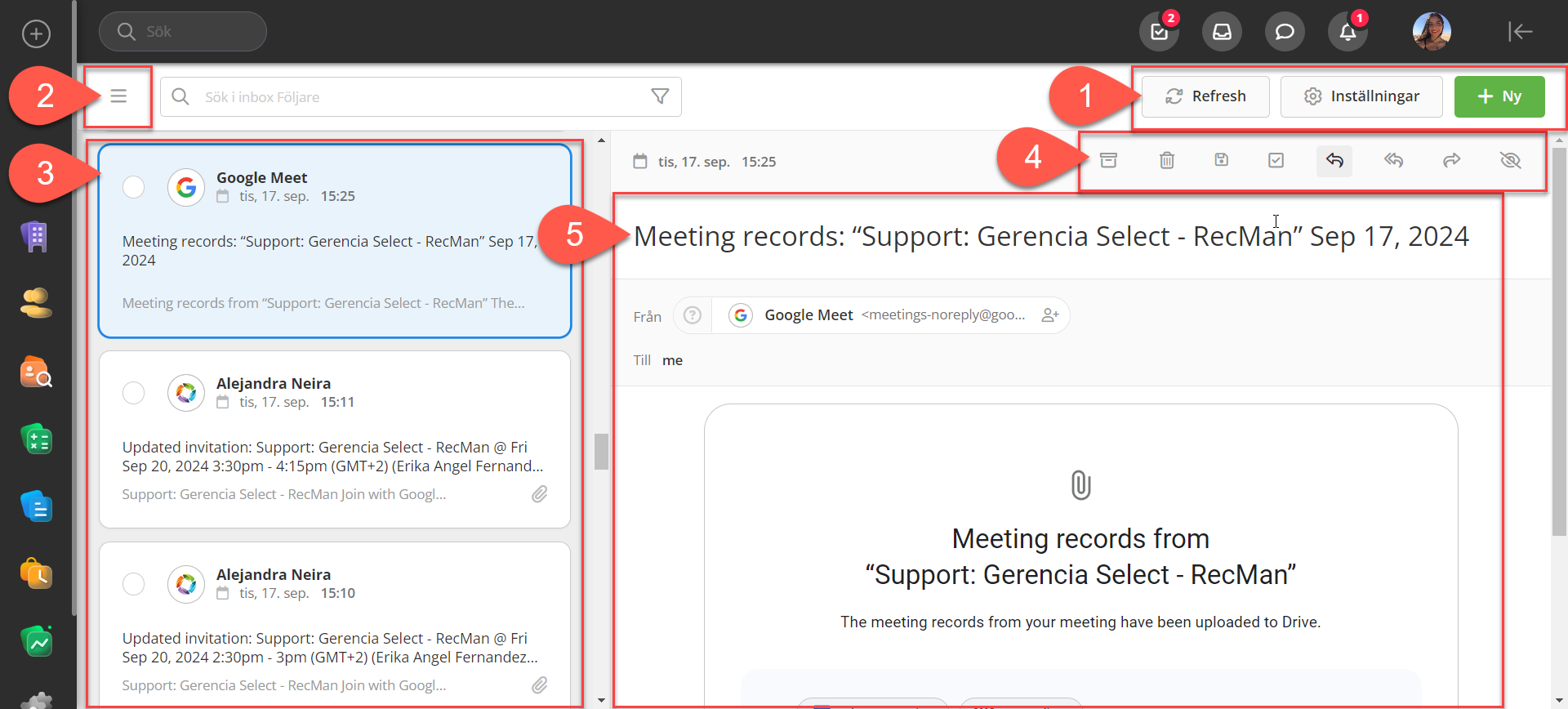 Inom de närmaste minuterna efter att du har tillåtit de nödvändiga behörigheterna. Om din anslutning lyckas kommer e-postmeddelanden att börja synkroniseras, och det kan ta lite tid innan allt blir tillgängligt. När integrationen är klar med synkroniseringen ser du din inkorg i RecMan. Nedan beskrivs de olika avsnitten.
