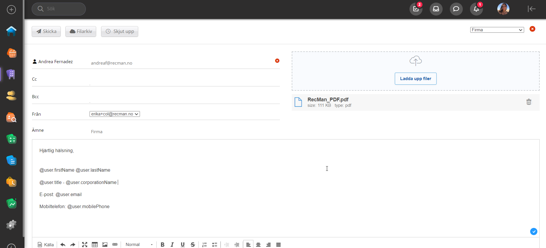 Att skicka ut mejl i RecMan kan göras från flera ställen. För att nämna några kan detta göras från CRM, kandidatdatabas, projektkort och fakturaöversikt. Genom att markera en kandidat eller klicka på dennes e-postadress i kandidatkortet öppnar du fönstret Nytt meddelande: