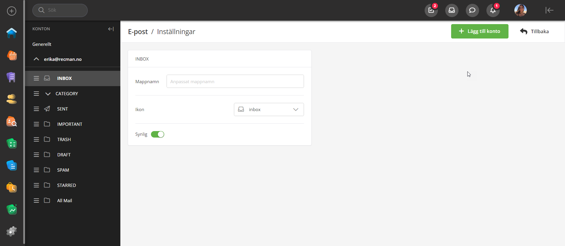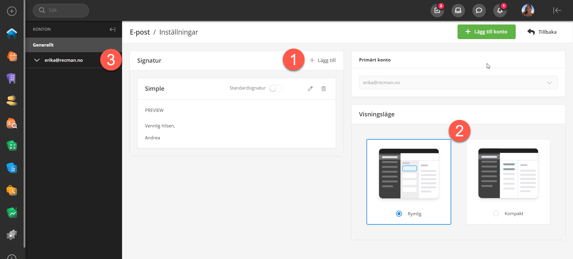 I det här avsnittet går vi igenom hur du ställer in din e-post för ditt RecMan-konto och hur du ställer in sändning för din domän i e-postinställningarna.