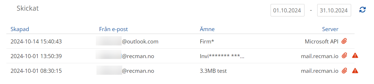 Om gränsen för bifogade filer överskrids, ett exempel ges nedan. Felmeddelandet visas bredvid den bifogade symbolen i skickade e-postmeddelanden, vilket signalerar att e-postmeddelandet, som nu överskrider gränsen, har omdirigerats via mail.recman.io-servern istället för Microsofts API.