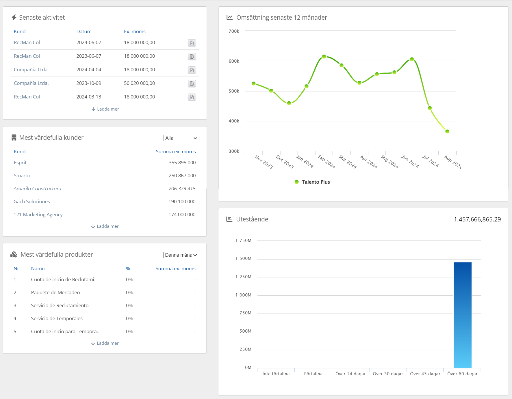 RecMans ekonomimodul ger en snabb överblick över de senaste fakturorna, de mest värdefulla kunderna och produkterna. För de två sista kan du använda rullgardinsmenyn för att ändra dataurvalet från denna månad till föregående månad, senaste 6 månaderna, i år eller förra året om du vill jämföra perioderna.