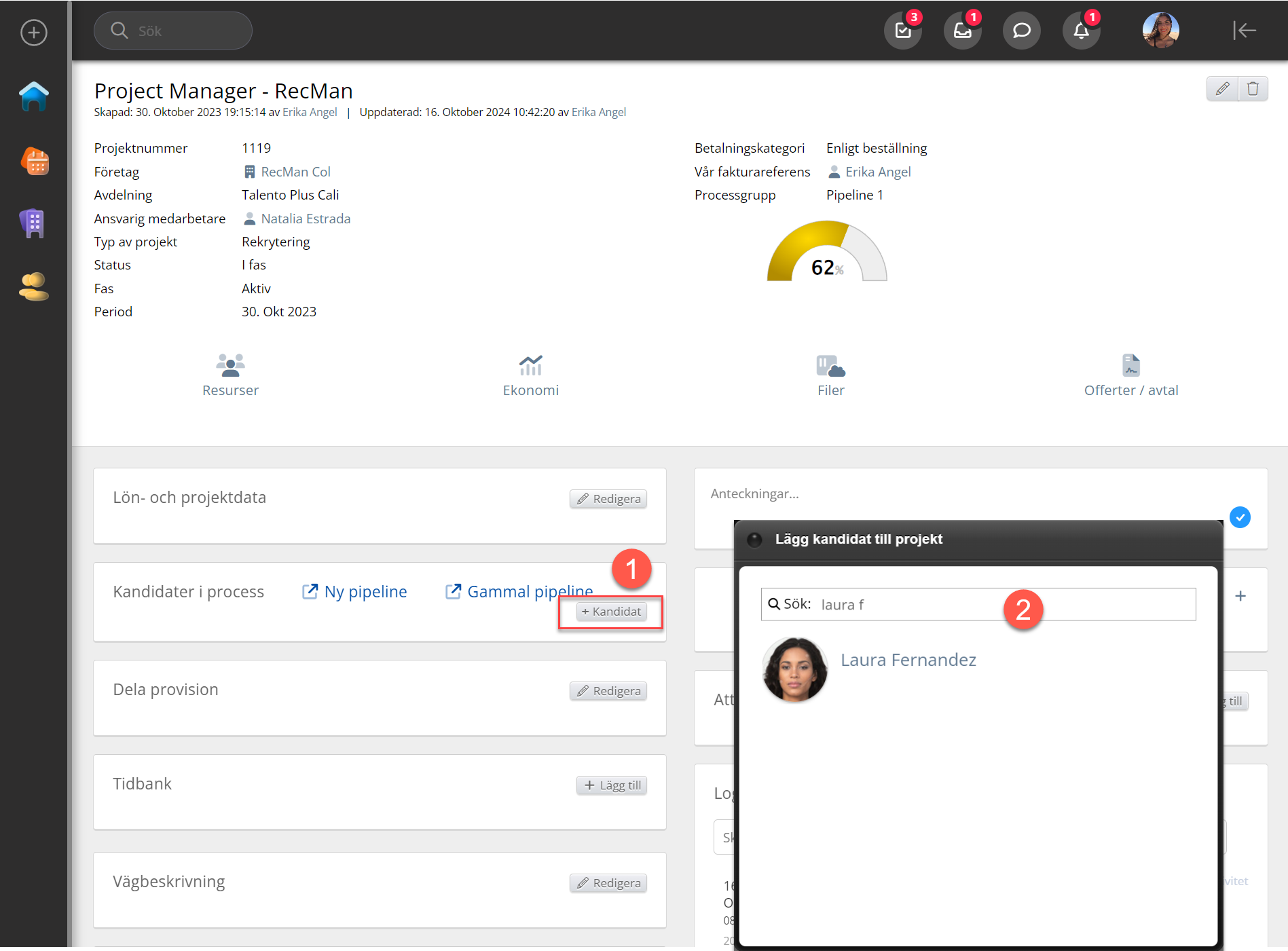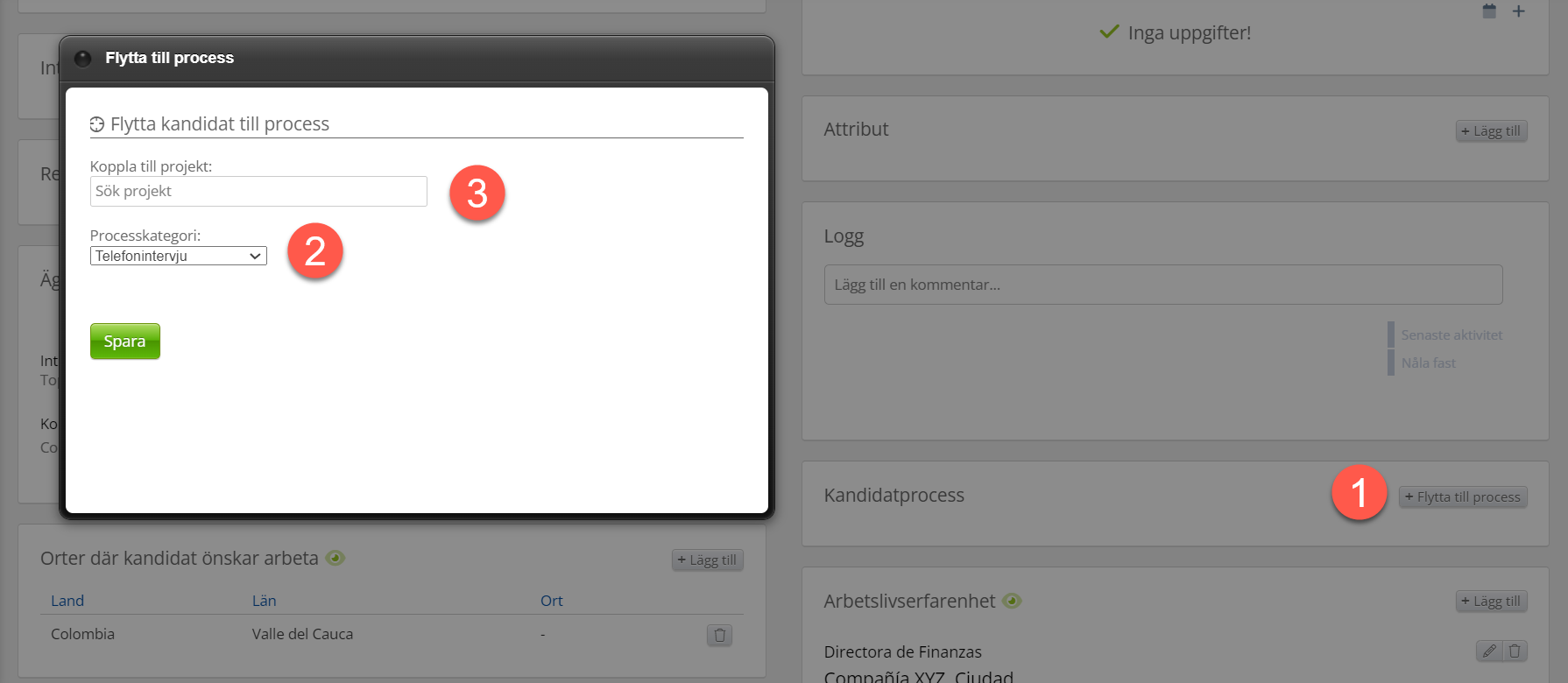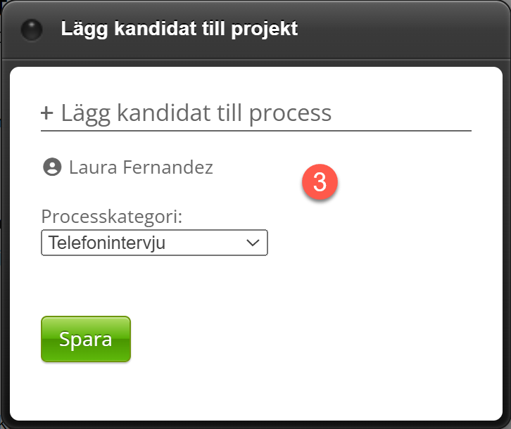- Klicka på "Lägg till i process" i menyn som visas när du bockar av en kandidat.