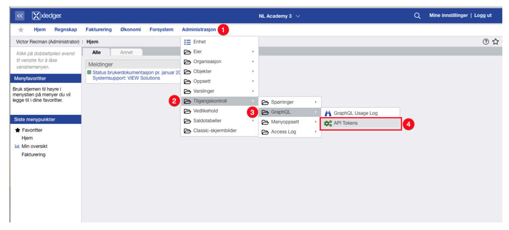 - När du är inloggad som administratör i Xledger, gå till Administration i huvudmenyn.
