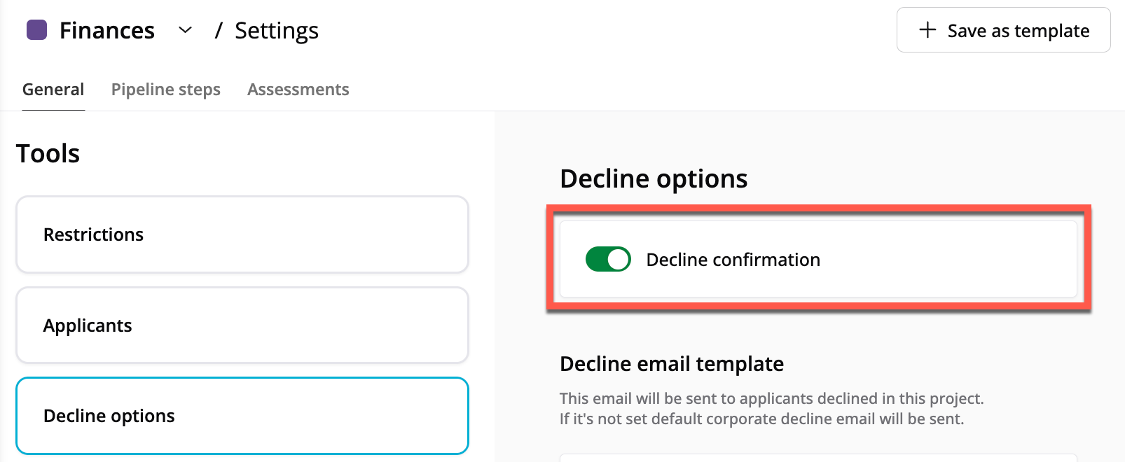 För att kunna använda olika avslagsalternativ när du ska återkoppla till kandidater, aktivera först bekräftelse på avslag. Det aktiverar ett popup fönster när man klickar på avslagsknappen.