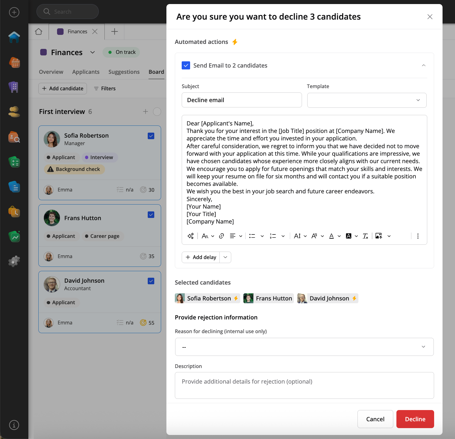 När du avslår en sökande kan du även redigera den förinställda meddelandemallen och ange en fördröjning direkt i popup-fönstret.