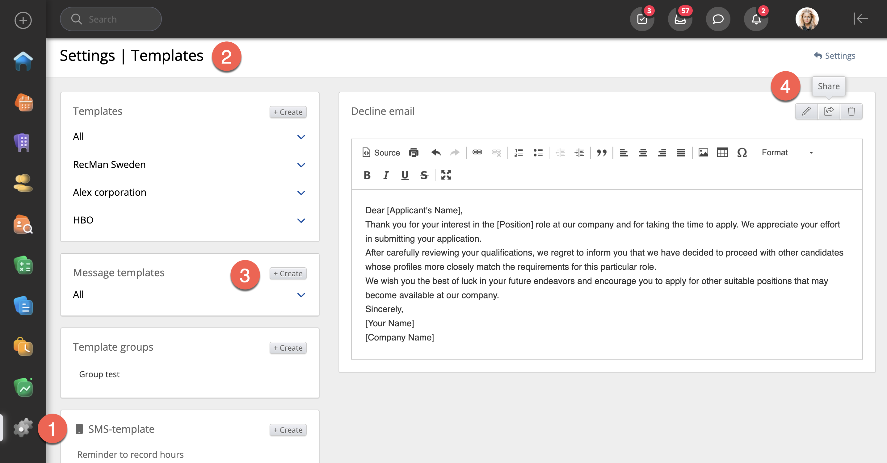 Du kan använda dina e-postmallar för både manuella och automatiska avslagsmeddelanden. Lägg till dem under din profil eller i Mallar → Meddelandemallar och välj användningsområde Alla eller Epost avslag sökande. Dela sedan med dina kollegor, inklusive dig själv. Läs mer om mallinställningar i denna artikel.