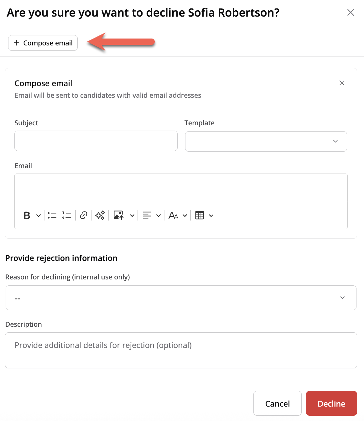 Att lämna båda mallarna tomma innebär att inga e-post skickas vid avslag av sökande. Att skicka e-post vid avslag kan vara bra för de som vill ge professionell återkoppling eller en personlig touch till sina kandidater.