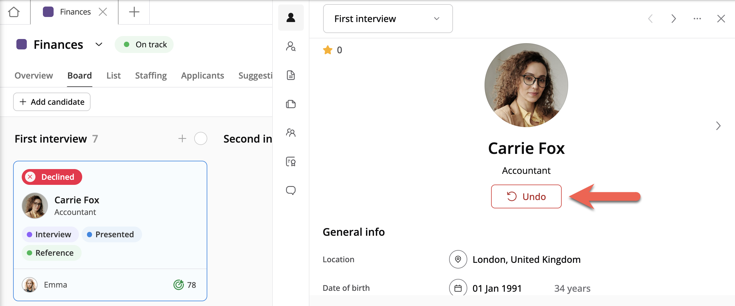 Du kan ångra ett avslag, vilket hjälper till att säkerställa att ingen kvalificerad kandidat av misstag tas bort från urvalet. Du når denna funktion direkt från kandidaten genom att hovra över knappen för Avvisad status, som då ändras till knappen Ångra. Kandidatens status ändras från Avvisad tillbaka till Obearbetad.