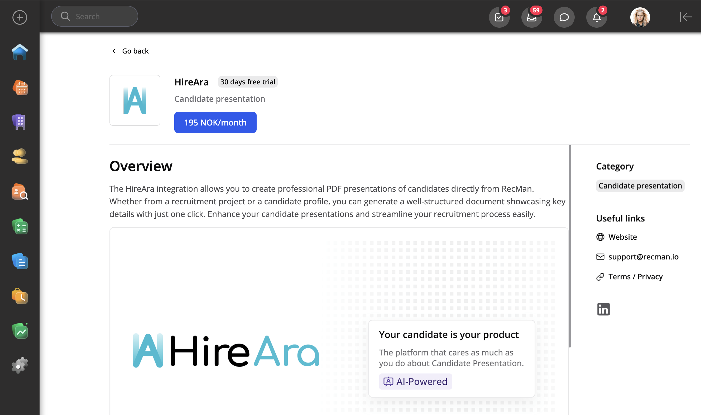 Med HireAra-integrationen kan du enkelt skapa professionellt formaterade kandidat-CV:n baserade på dina egna mallar. Denna integration effektiviserar din kandidatpresentation genom att möjliggöra snabb och konsekvent CV-formatering utan att lämna RecMan.