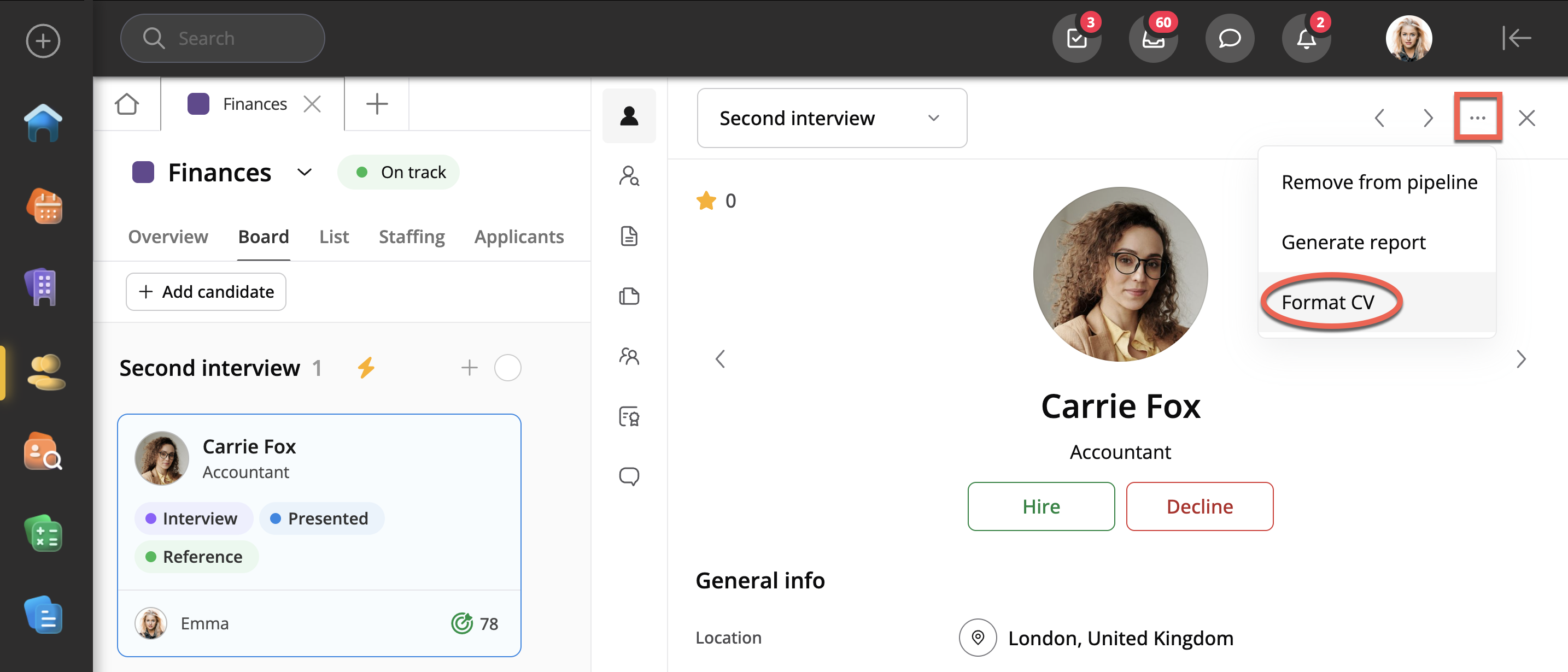 Gå till Rekryteringsmodulen och välj ditt projekt. Klicka sedan på kandidaten för att öppna kandidatvyn, klicka på knappen med 3 punkter och välj Formatera CV. Se till att kandidaten har ett CV bifogat som visas under Filer eller under Bilagor i CV-fliken.
