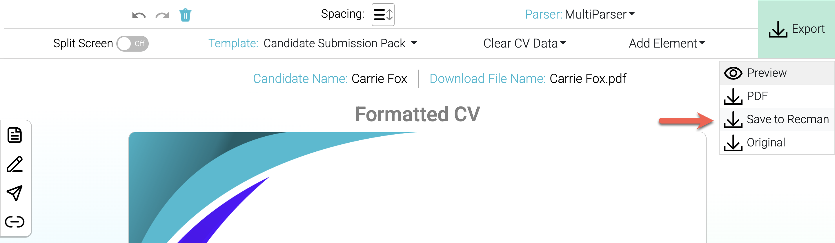 Använd HireAras gränssnitt för att formatera CV:t enligt dina mallar. Upptäck mer om att skapa mallar i HireAra genom att besöka deras dedikerade hjälpartikel här. Använd sedan Export-knappen för att spara det formaterade CV:t direkt tillbaka till kandidatvyn i RecMan.