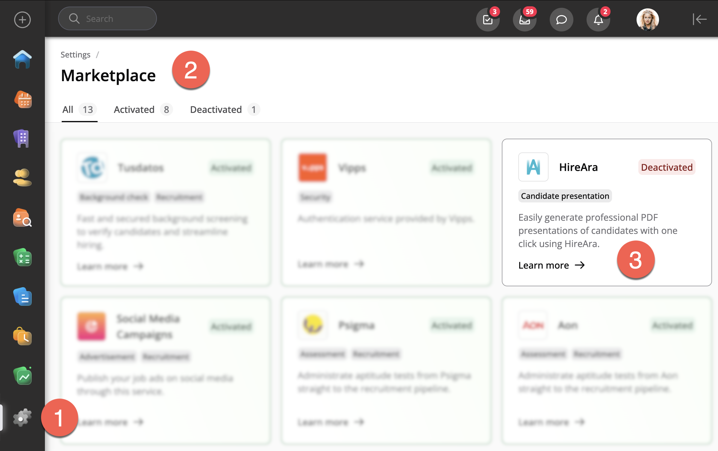 För att aktivera HireAra integrationen, gå till Systeminställningar och välj Marketplace.