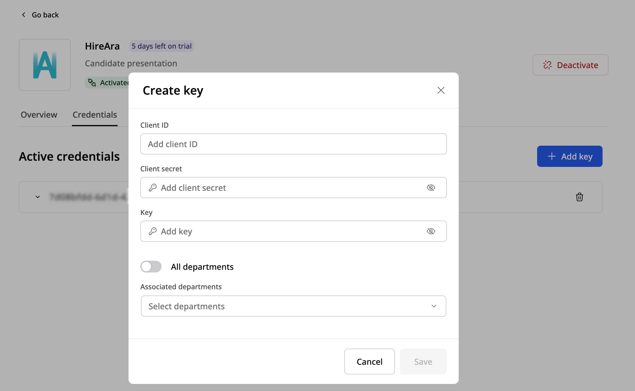 Nästa steg är att lägga till ditt Client ID, API-nyckel och säkerhetskod som tillhandahålls av din HireAra-konsult. Välj om Client ID ska vara tillgängligt för: