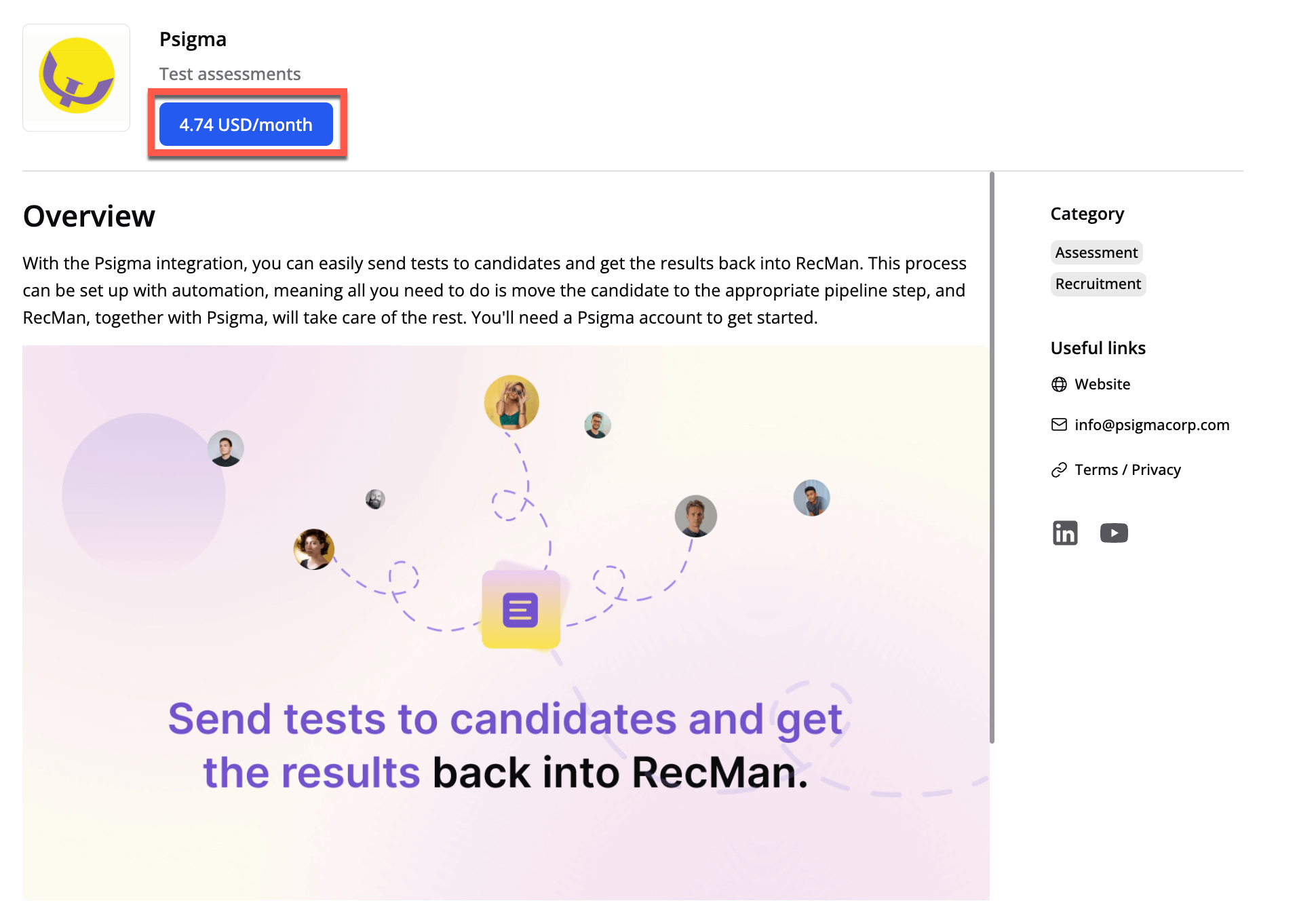 Med Psigma-integrationen kan du enkelt skicka tester till kandidater och se resultaten i RecMan. Detta kan ställas in med automation, vilket innebär att allt du behöver göra är att flytta kandidaten till rätt steg i processen och RecMan, tillsammans med Psigma, tar hand om resten.