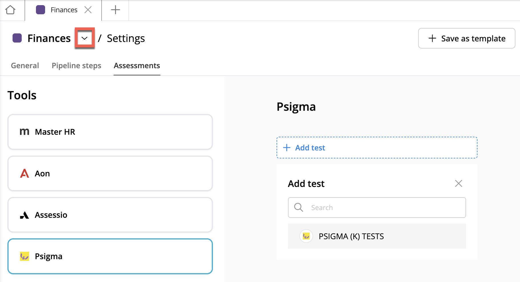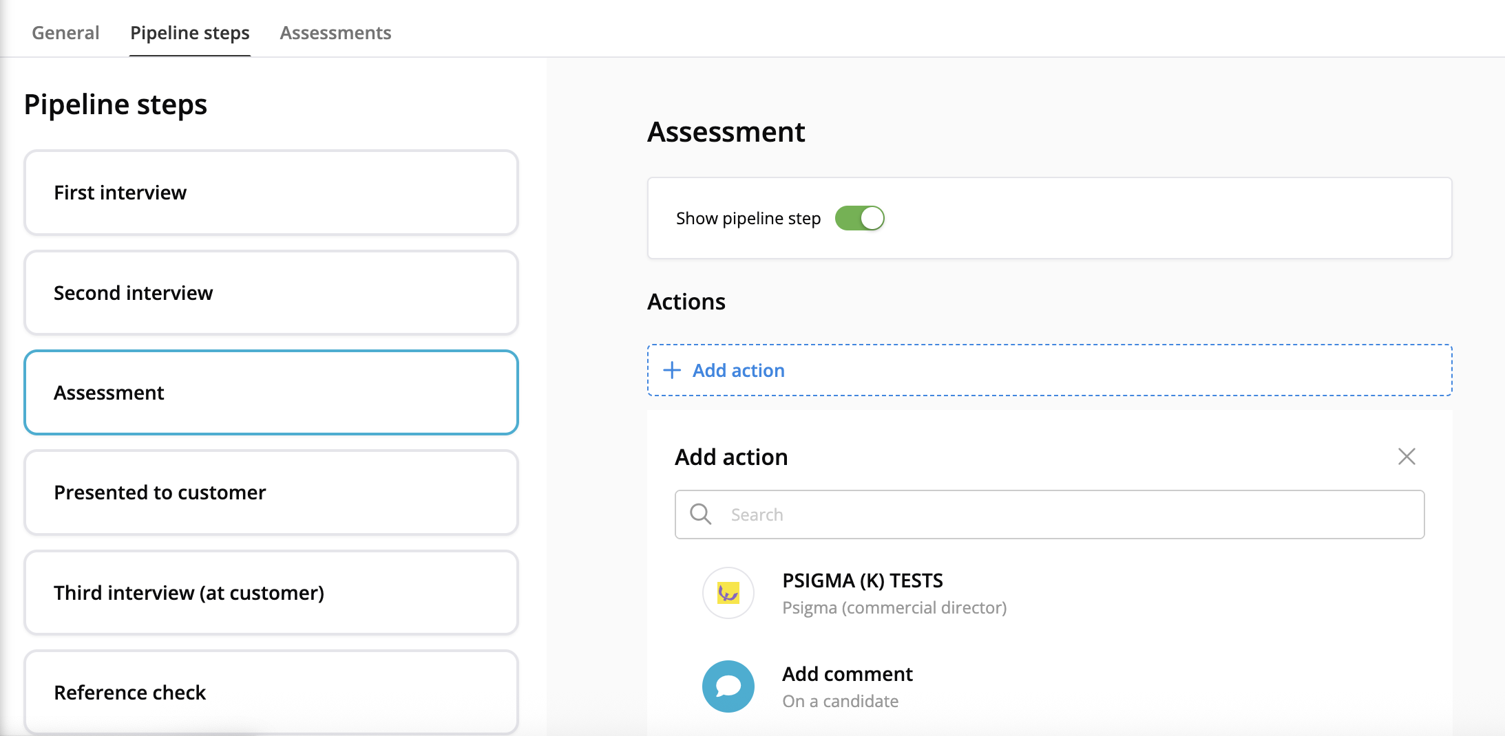 Slutligen, konfigurera processteg. Även det gör i projektinställningar, i Processteg. Välj sedan Psigma-testet för önskat steg. I exemplet nedan lägger vi till testet "Psigma (commercial director)" till processteget Assessment.