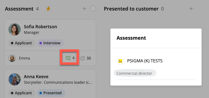 När kandidaten har slutfört testet kommer en poäng att visas på kandidatkortet. När du klickar på den får du två länkar för att läsa mer om testresultatet.