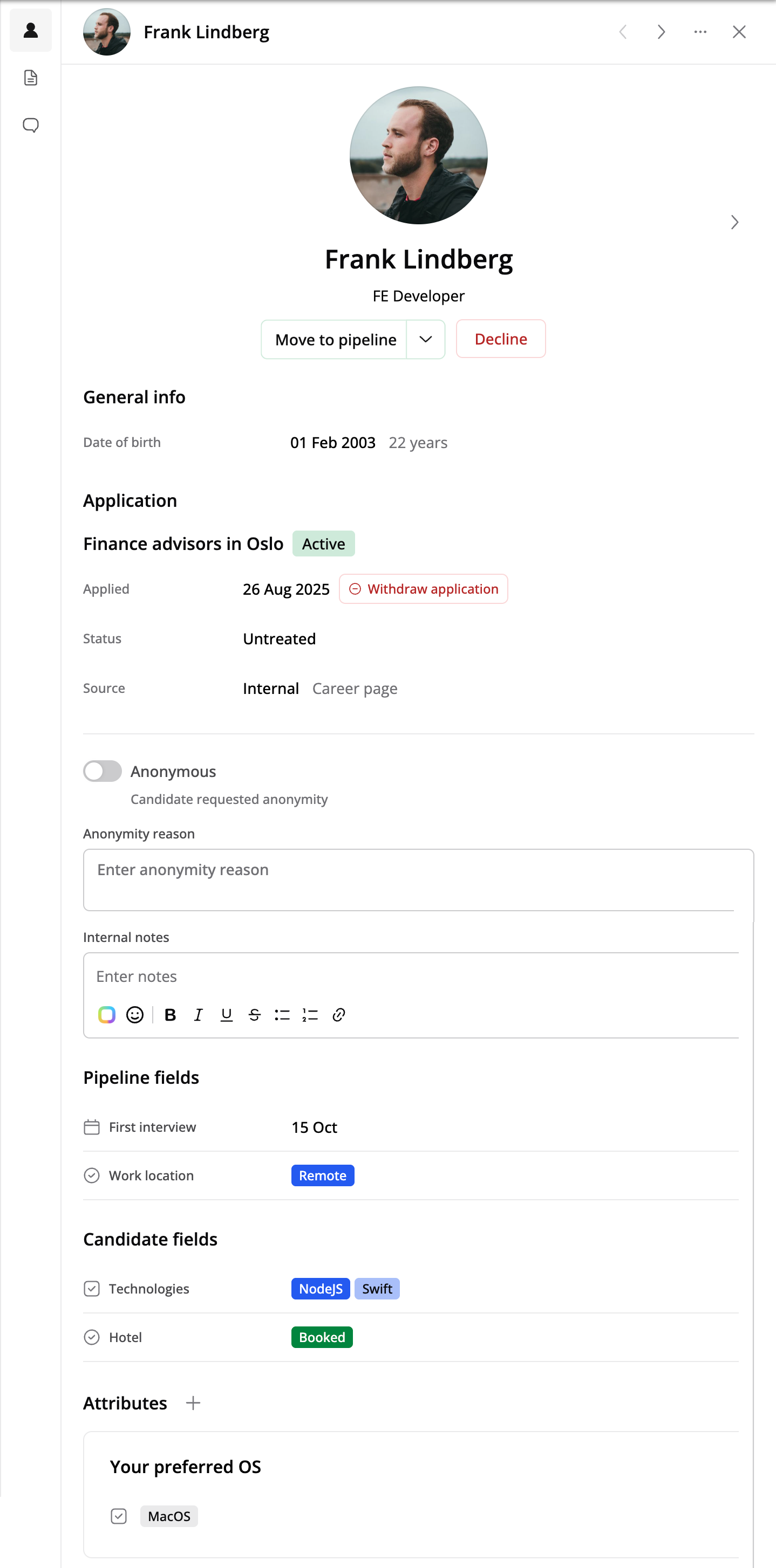 - Kandidatfält - Anpassade fält som visas på kandidaten i alla projekt. Läs mer om deras inställning här.