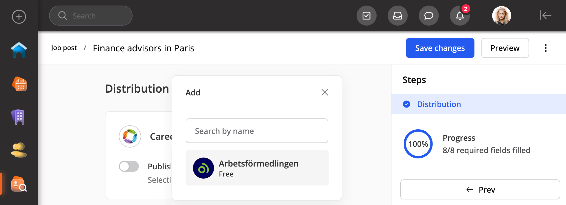 - När du skapar en platsannons, i steget Distribution, klicka på +Lägg till och välj Arbetsförmedlingen.